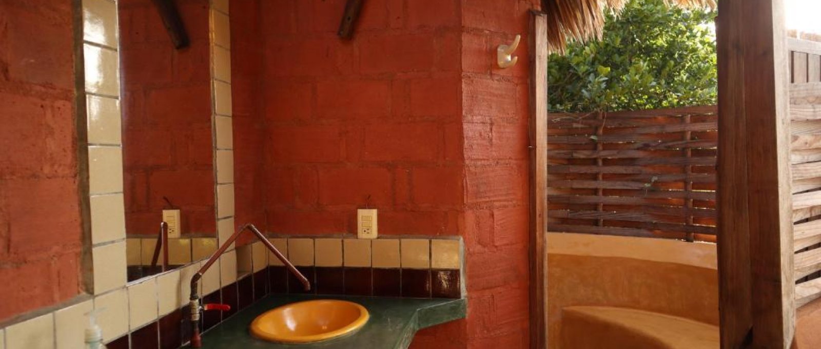Papaya comparte un espacio bonito rodeado de plantas afuera con hamacas y una mesa bajo de una sombra con Mango (el cuarto al lado). Se encuentras arriba en el cerro y cerca de nuestro porton #2. Tiene baño ecológico seco y la ducha al aire libre. No tienen vista al mar pero se puede disfrutar de la vista de los sillones en la recepción.